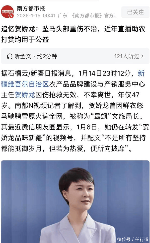 2026 年 1 月 14 日 23 时 12 分,一则噩耗传遍全网:新疆维吾尔自治区农产品品牌建设与产销服务中心主任贺娇龙,因伤抢救无效不幸离世,年仅 47 岁。这个曾身披红袍、策马驰骋在昭苏雪原,被网友称为 “最飒文旅局长” 的女人,永远定格在了她挚爱的这片土地上。