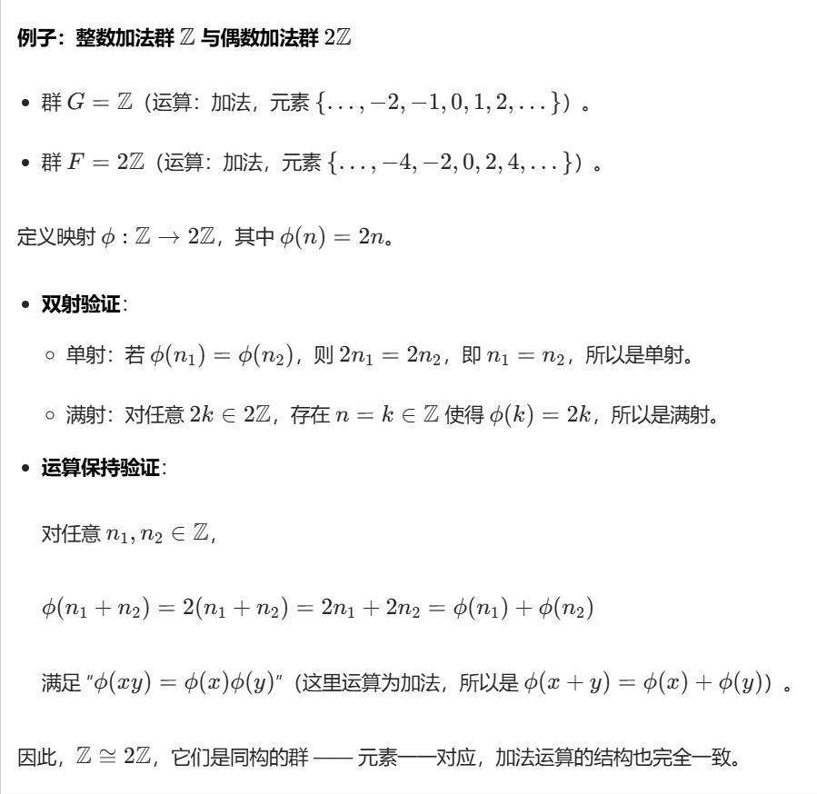 群的同构意味着两个群在 “结构层面完全一致”,只不过元素的 “称谓” 或者 “呈现形式” 有所不同。就如上述例子,Z和2Z从本质上讲属于同一类型的群(无限循环群),只是元素分别以整数n和偶数2n来体现。